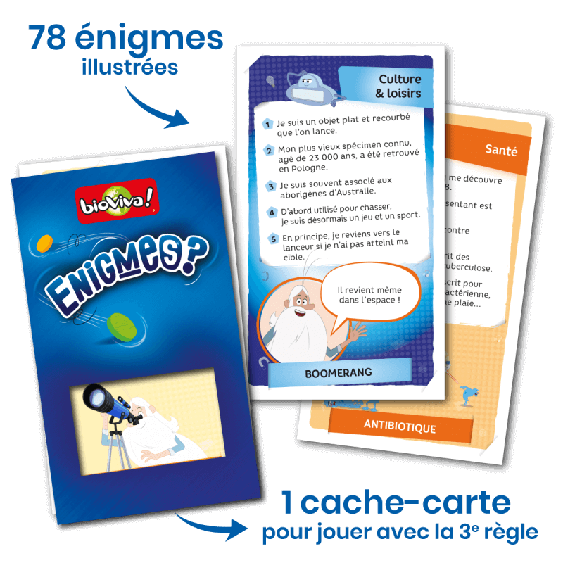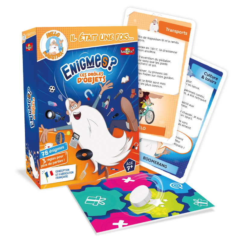 Ce jeu de cartes invite les enfants dès l'âge de 7 ans à deviner les objets insolites qui se cachent derrière 5 indices. Le meneur du jeu dévoile les indices progressivement si aucun des autres joueurs n'a trouvé la réponse du premier coup. Plus les indices s’enchaînent, plus le mystère se dévoile . Le but : être le plus rapide à identifier l’objet mystérieux. Le jeu peut se jouer uniquement avec les cartes ou, pour une expérience plus ludique, avec le plateau de jeu. Dans cette version, selon la couleur de la carte, le joueur lance le jeton sur le plateau. En fonction de la case sur laquelle il atterrit, il doit relever un défi associé : épeler correctement le nom de l’objet mystère pour marquer le point, doubler le nombre de cartes gagnées si la réponse est bonne, offrir une carte à un autre joueur, ou encore passer son tour. Ce jeu développe la déduction, la culture générale et l’écoute. Un jeu amusant qui stimule la curiosité, la mémoire et l’expression orale tout en favorisant la convivialité. Contenu : 78 énigmes illustrées (39 cartes recto-verso), 1 plateau de jeu recto-verso en carton rigide, 1 cache-carte en carton, 1 jeton en bois, 1 règle du jeu. Age 7 ans et plus.