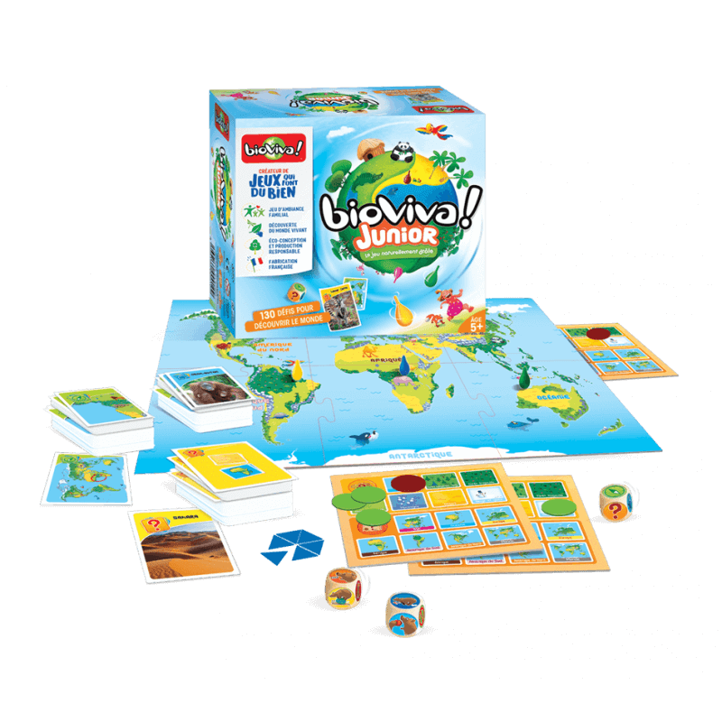 Avec Bioviva Junior, partez en exploration autour du monde . À travers mimes, défis et épreuves de localisation, les plus jeunes découvriront les animaux qui peuplent notre Terre et ses lieux emblématiques . Tentez de gagner le maximum de points à l’issue des 3 épreuves inspirées du célèbre «Bioviva- Le Jeu» et adaptées pour les 5 ans et plus . Le principe du jeu : A chaque tour de jeu, le meneur lance le dé pour découvrir quelle épreuve sera jouée. Le jeu comporte 3 épreuves : «Merveilles de la Terre», «Zoom sur le monde» et «Impro’nimaux». Le joueur qui remporte le maximum de points «Viva» gagne la partie.