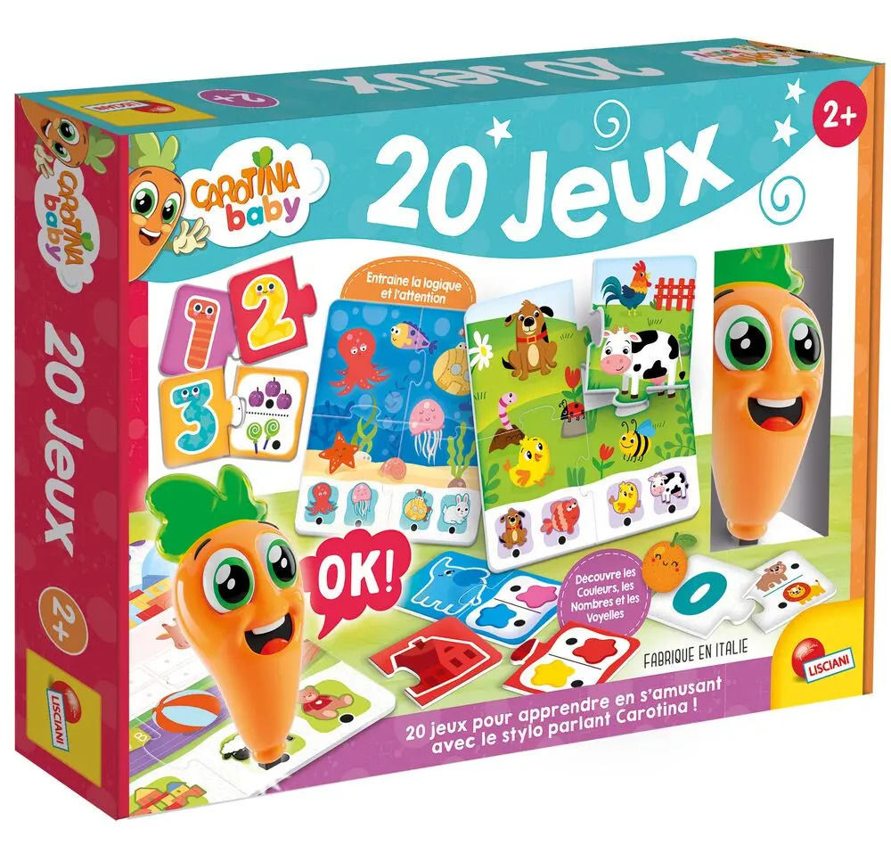 Offrez aux tout-petits une première expérience ludique et éducative avec le nouveau Carotina Baby Stylo Parlant. Ce coffret contient 20 jeux conçus spécialement pour stimuler la logique, l'attention et les capacités d'observation des enfants des 2 ans. Le stylo parlant, adapté aux petites mains, guide les enfants tout au long des activités grâce a des réponses sonores amusantes et motivantes. Les jeux colorés et illustrés, a la difficulté progressive, accompagnent les enfants dans leurs premiers apprentissages : formes, couleurs, animaux, objets du quotidien, premiers mots et plus encore. Une façon idéale d'éveiller la curiosité, de renforcer la concentration et de développer l'autonomie, tout en s'amusant. Dimensions boîte : 38 x 28 x 5,5 cm - Age préconisé: 2 ans +