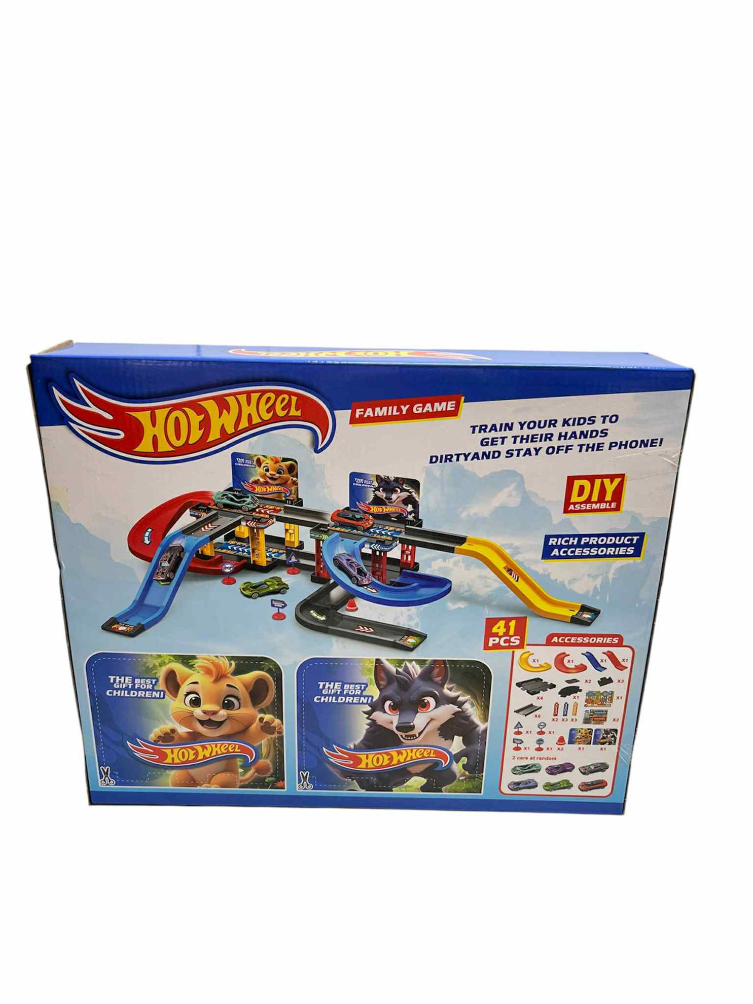 Circuit Hot Wheels de 41 pièces, thème forêt avec personnages animaux. Comprend des pistes à deux niveaux, des virages et rampes, plusieurs voitures, et divers accessoires. Set DIY à assembler, pour enfants 3 ans et plus.