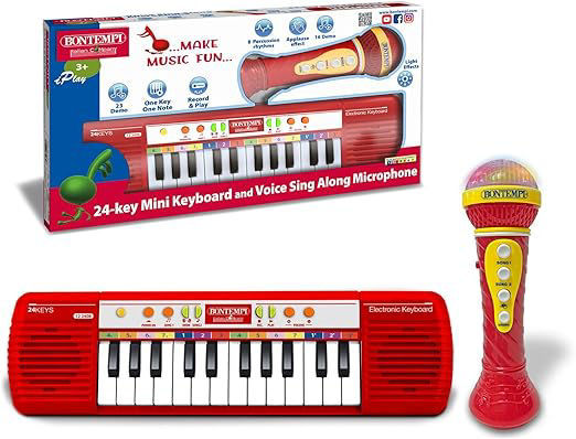 Clavier électronique avec 24 touches • 16 mélodies • 7 mélodies avec accompagnement • OKON (fonction d'apprentissage) • Fonction d'enregistrement et de lecture • Réglage du volume • Arrêt automatique • Nécessaire : 4 piles R6/AA de 1,5 V (non incluses)