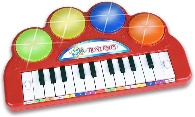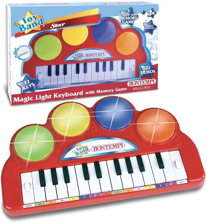 Clavier électronique de table 22 touches, 3 fonctions: clavier, 22 mélodie et jeu de mémoire musicale, 4 pads pour jouer la batterie, Jeu de mémoire musicale en suivant les lumières sur les pads, Effets lumineux, Alim.: 3 piles de 1,5V R6/AA (non fournies), Dim: 280x162x45 mm Avertissement De Sécurité ne convient pas aux enfants de moins de 3 ans