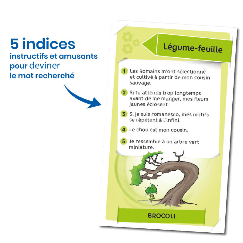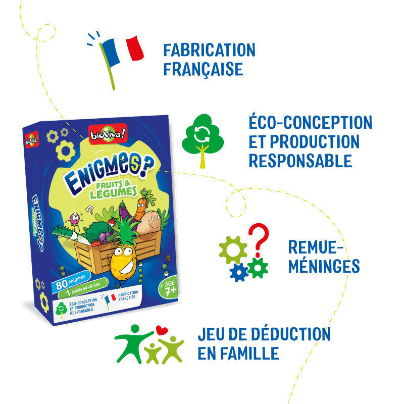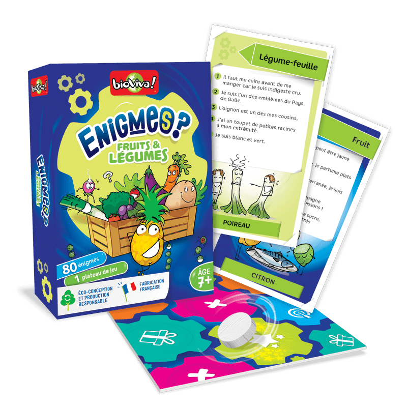 Avec Enigmes - Fruits et légumes, tentez d’être le plus rapide à deviner les fruits et légumes qui se cachent derrière 5 indices instructifs et amusants. Faites preuve d’adresse en lançant le jeton sur le plateau pour tenter de gagner plus de cartes Enigmes - Fruits et légumes . Le premier joueur à collecter 6 cartes remporte la partie . Alors, qui sera le plus rapide à deviner les mots recherchés ? Découvrez le en jouant à Enigmes - Fruits et légumes . Enigmes - Fruits et légumes c’est : ✓ 80 mots à deviner . ✓ 5 indices par carte . ✓ 5 sous thématiques = Fruit, Légume-racine, Fruit exotique et à coque, Légume-feuille et Légume-fruit. ✓ Un plateau de jeu .