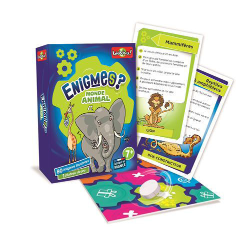 Serez-vous le plus rapide à deviner les énigmes du monde animal qui se cachent derrière les 5 indices ? Attention ! Il vous faudra aussi faire preuve d’adresse en lançant votre jeton sur le plateau pour gagner (ou non) plus de cartes…De 2 à 6 joueurs. Dès 7 ans. Fabriqué en France.