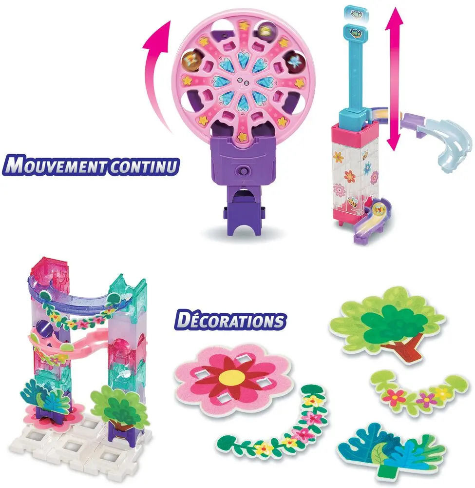Le Marble Rush - Fairy Garden Set M500E est un circuit féerique dès 4 ans, composé de 90 pièces et 6 MarbleBilles pour vivre des aventures magiques. La grande roue et le vortex cascade plongent les enfants dans un univers enchanté, enrichi de décors en feutrine qui ajoutent une touche de magie à chaque construction. Le parcours est ponctué de passages secrets, aiguillages et zones d’interaction pour faire évoluer les billes de manière ludique et surprenante. Trois niveaux de construction sont proposés dans le guide pour accompagner l’enfant pas à pas. Ce jeu développe créativité, motricité et logique tout en offrant des combinaisons infinies.