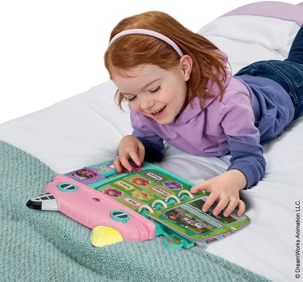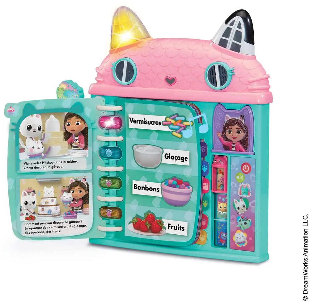 La maison-livre éducative invite les enfants dès 3 ans à découvrir l’univers de Gabby et ses amis à travers un livre interactif de 14 pages illustrées. Chaque pièce de la Maison Magique devient un terrain de jeu pour apprendre en s’amusant. Les 7 pages recto-verso interactives permettent de rencontrer les Gabbychats, d’explorer les différentes pièces de la maison, et de découvrir les chiffres et les lettres. À chaque page, des histoires captivantes prennent vie, enrichies de vocabulaire et d’animations. Le « chascenseur » interactif permet de choisir entre 3 modes : histoires & vocabulaire, musique et défis. 4 boutons interactifs accompagnent l’enfant dans ses découvertes, les boutons Personnages offrent des informations amusantes sur Gabby et ses compagnons. La maison-livre est équipée d’un réglage du volume sonore et d’un arrêt automatique.