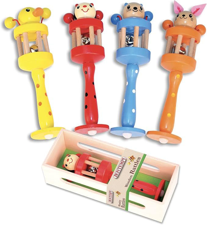 Hochet en bois de 19 cm. Coloré, léger et compact, il tient parfaitement dans la paume de la main des enfants. Couleurs assorties. Découvrez la gamme de hochets en bois colorés de Bontempi.