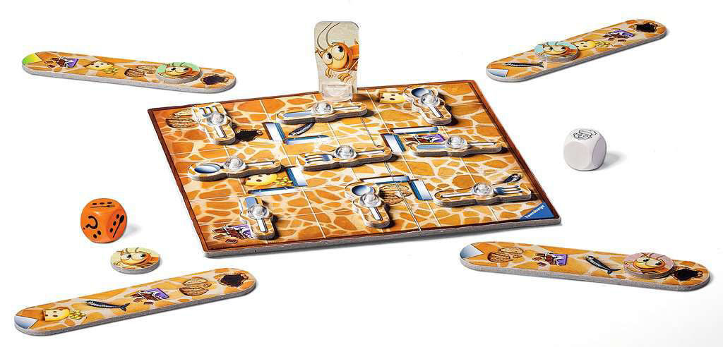 Jeu où les dés roulent et les couverts pivotent à toute allure! *Autres informations produit: Affamé, le cafard fonce à travers la cuisine. Tournez astucieusement les couverts pour l’attirer vers les délicieux aliments. Mais attention, vous risquez d’être interrompus par l’arrivée du cuisinier ! *Contenu: 1 plateau de jeu, 9 couverts, 1 cafard, 4 réglettes Nourriture, 4 jetons Cafard, 2 dés, 1 règle du jeu