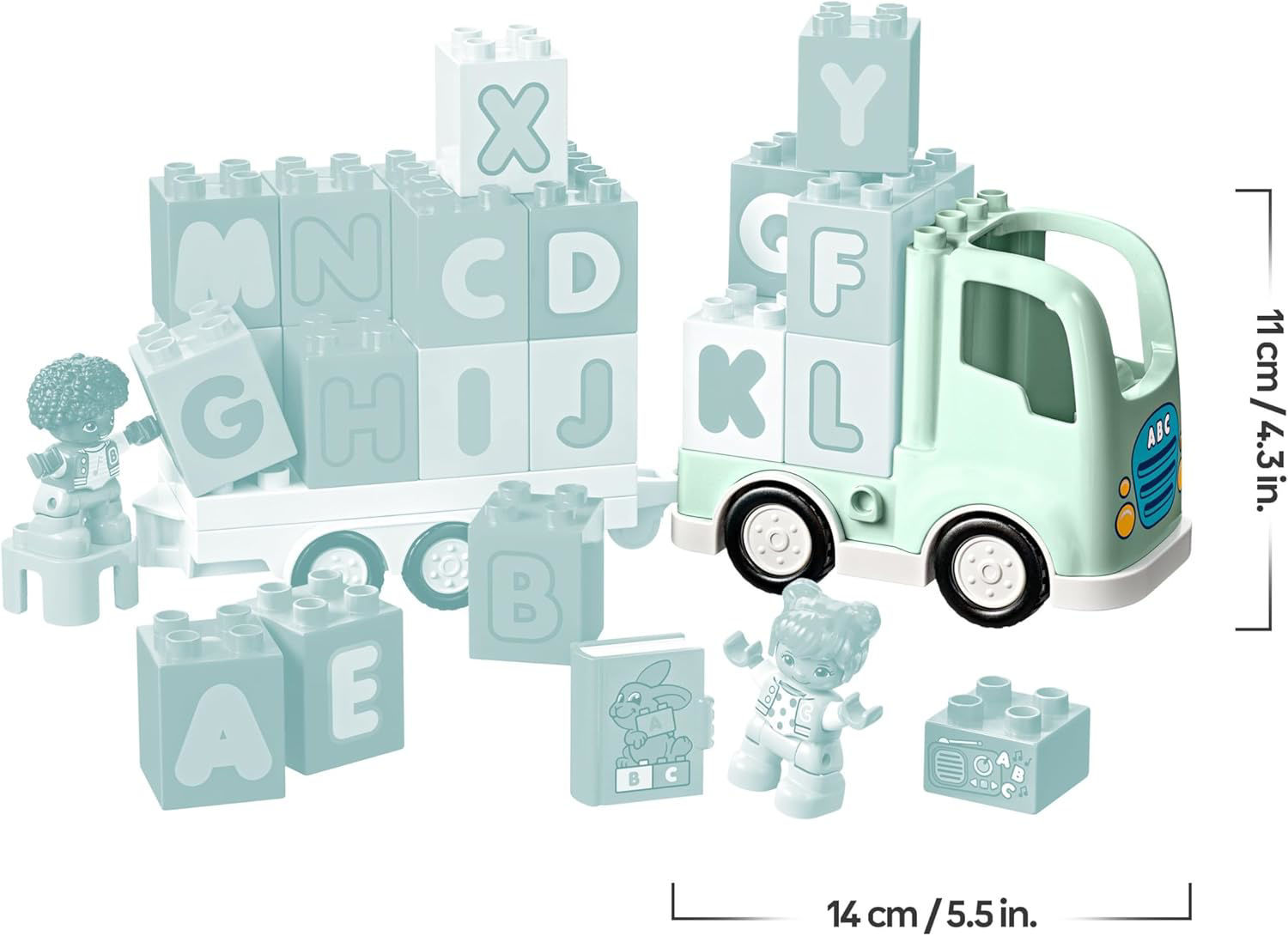Stimulez l'apprentissage des lettres des tout-petits avec le jouet de construction LEGO DUPLO Le Camion de l'Alphabet (10421) pour les enfants d'âge préscolaire. Ce jouet créatif offre de nombreuses possibilités d'apprentissage ludique. En connectant la remorque au camion-jouet et en aidant les 2 figurines LEGO DUPLO à charger et décharger les briques, les tout-petits commencent à reconnaître les lettres, à apprendre les couleurs, à améliorer leur langage et à perfectionner leurs compétences motrices fines. Des accessoires imaginatifs comprennent un élément de jouet LEGO DUPLO ABC et un élément stéréo pour encourager des chants ABC amusants avec les parents et les tout-petits. Ce jouet éducatif encourage les tout-petits à inventer des histoires créatives alors qu'ils montent dans la cabine de leur jouet de camion et partent pour de nouvelles aventures ! Cet ensemble comprend un camion qui mesure plus de 11 cm de haut, 14 cm de long et 7 cm de large. Le set contient 36 pièces.