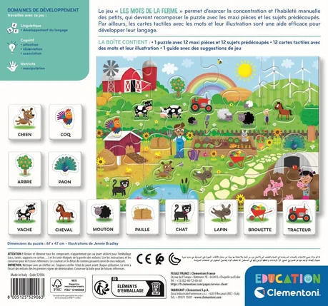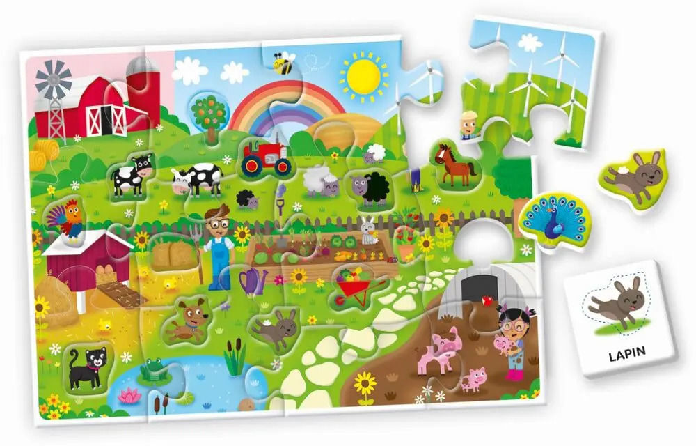 Un puzzle coloré composé de grandes pièces pour faire découvrir l'univers de la ferme aux tout-petits. En plus des grandes pièces à encastrer, le puzzle contient également des silhouettes d'animaux de la ferme à placer dans le bon environnement. Ces mêmes animaux peuvent être placés par-dessus les silhouettes imprimées sur les cartes nomenclature , qui indiquent leur nom. Les silhouettes d’animaux ont également une surface en relief qui invite l’enfant à l’exploration tactile. L’enfant peut ainsi, dès son plus jeune âge, développer ses capacités manuelles et son langage.