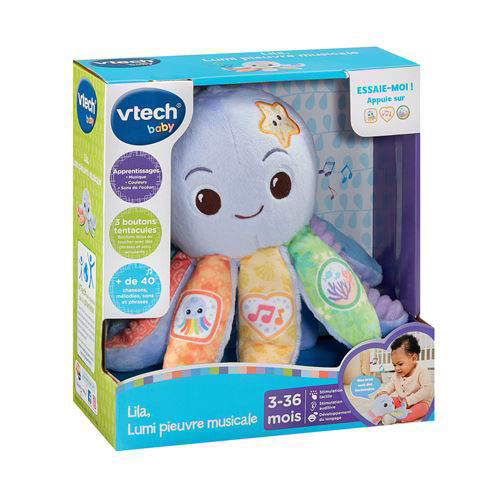 Lila, Lumi pieuvre musicale - 3 - 36 mois. Une pieuvre interactive et colorée pour des découvertes musicales et marines rythmées .Cette adorable peluche en forme de pieuvre ravira les tout-petits grâce à son contenu musical et à ses fonctions amusantes.3 boutons souples sont présents sur ses tentacules :Un bouton Pieuvre pour déclencher des phrases et des sons amusants .Un bouton Musique pour déclencher des chansons et des mélodies .Un bouton Sons de l'océan pour apaiser Bébé. Lorsque Bébé appuie sur l’un de ces trois boutons.
