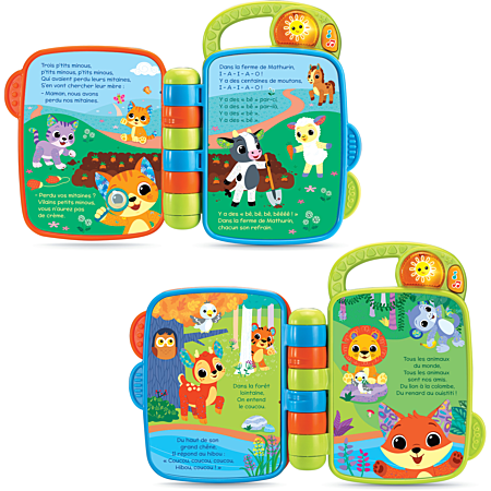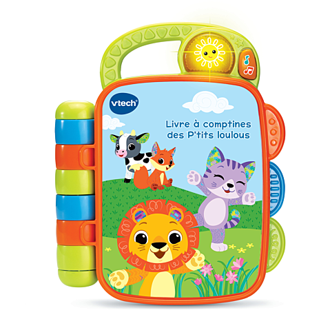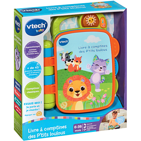 Livre à comptines des P'tits loulous - 6 - 36 mois Un premier livre interactif et musical avec poignée intégrée à emporter partout avec soi ! 4 pages illustrées avec les personnages des P’tits loulous pour découvrir les paroles des 4 comptines du livre : Tous les animaux du monde, Trois p’tits minous, Dans la ferme de Mathurin et Dans la forêt lointaine. Magique ! En tournant les pages du livre, Bébé déclenche automatiquement des sons amusants et des comptines. La couverture du livre s’anime également quand on la fait bouger grâce à son image lenticulaire. 1 bouton lumineux permet à Bébé de découvrir les animaux et leur cri et 1 bouton Musique lui permet d’entendre des mélodies. La poignée intégrée et adaptée aux petites-mains permet de transporter facilement le livre. 4 comptines et 15 mélodies. Réglage du volume sonore et arrêt automatique. Boîte Try-me. Fonctionne avec 2 piles LR03 fournies.