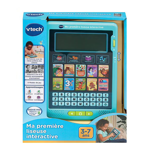 Avec Ma première liseuse interactive, les enfants à partir de 3 ans découvrent le plaisir de lire tout en s’amusant. Cette liseuse propose 10 contes traditionnels illustrés et lus à haute voix, pour initier les plus jeunes au monde de la lecture. Grâce à ses 4 touches Activités, l’enfant explore les lettres et leurs sons, apprend à former ses premiers mots, teste sa compréhension des histoires à travers des quiz, ou écoute des chansons et des mélodies. Les 26 touches Lettres permettent de découvrir l’alphabet, la phonétique et du vocabulaire associé. Sur l’écran, l’enfant pourra retrouver les différents textes, histoires et illustrations animées qui donnent vie aux récits. La molette permet de faire défiler le texte, et les flèches facilitent le changement de page. Pratique et intuitif, l’appareil dispose d’un réglage du volume sonore et du contraste de l’écran, ainsi que d’un arrêt automatique.