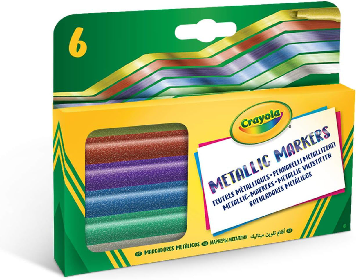 6 feutres métalliques Crayola pour faire briller vos créations Idéal pour les fournitures scolaires et les loisirs créatifs Ajoutez une touche scintillante à vos projets artistiques, vos créations et vos devoirs Fonctionne parfaitement sur carton, carton mousse, papier ordinaire et papier construction 8 couleurs aux tons métalliques : Lingot d'or, Mine de cuivre, Rose pailleté, Acier violet, Bleu cobalt, Vert machine, Noir fer et Argent brillant. Sûr et non toxique, à partir de 3 ans