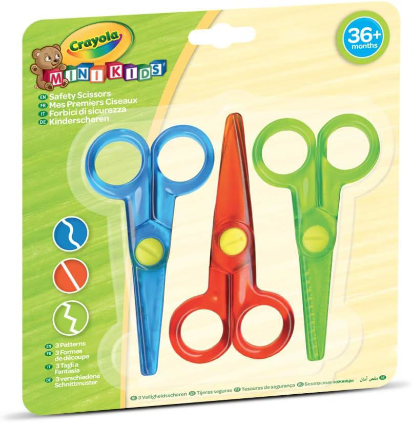 Idéal pour les petites mains. 3 ciseaux de sécurité avec poignée ergonomique, bouts arrondis et lames en plastique. 3 points de couture différents (droit, zigzag ou ondulé). Coupe uniquement le papier. Recommandé à partir de 3 ans.