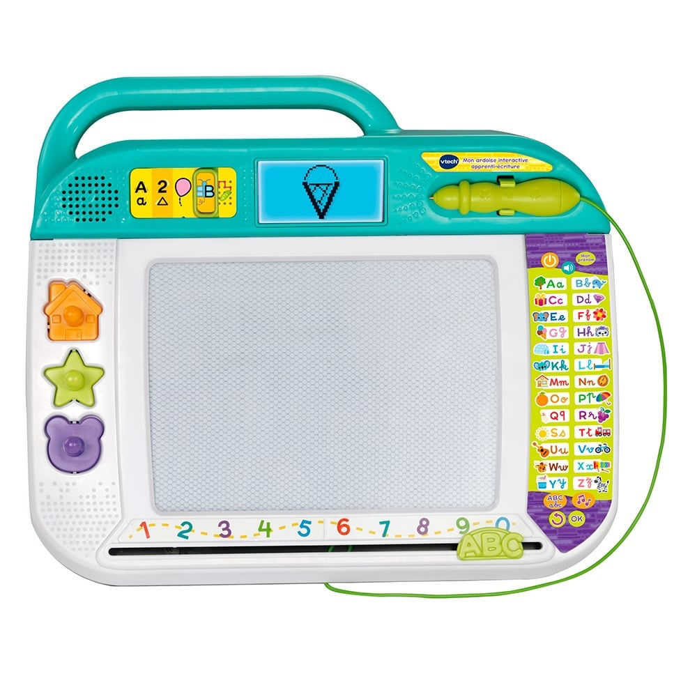 Mon ardoise interactive apprenti-écriture - 3 - 7 ans . Une ardoise interactive pour apprendre à dessiner et écrire en s’amusant ; *Une grande surface de dessin avec un stylet et son support de rangement, 3 tampons formes et 8 pochoirs pour dessiner et développer sa créativité. Une gomme pour effacer le dessin comme par magie. *5 modes de jeu pour apprendre à écrire les lettres, les chiffres, dessiner les formes et jouer. *Un écran LCD intégré pour suivre les étapes du tracé des lettres, chiffres et formes. *26 touches Lettres pour découvrir l’alphabet, apprendre à tracer les lettres en minuscule et en majuscule, découvrir des mots de vocabulaire, des objets et les couleurs. *1 touche Prénom pour apprendre à écrire son prénom et 1 touche musicale pour dessiner en musique.. Avec poignée de transport pour emmener son ardoise partout avec soi. Arrêt automatique et réglage du volume sonore. Piles de démonstrations fournies.