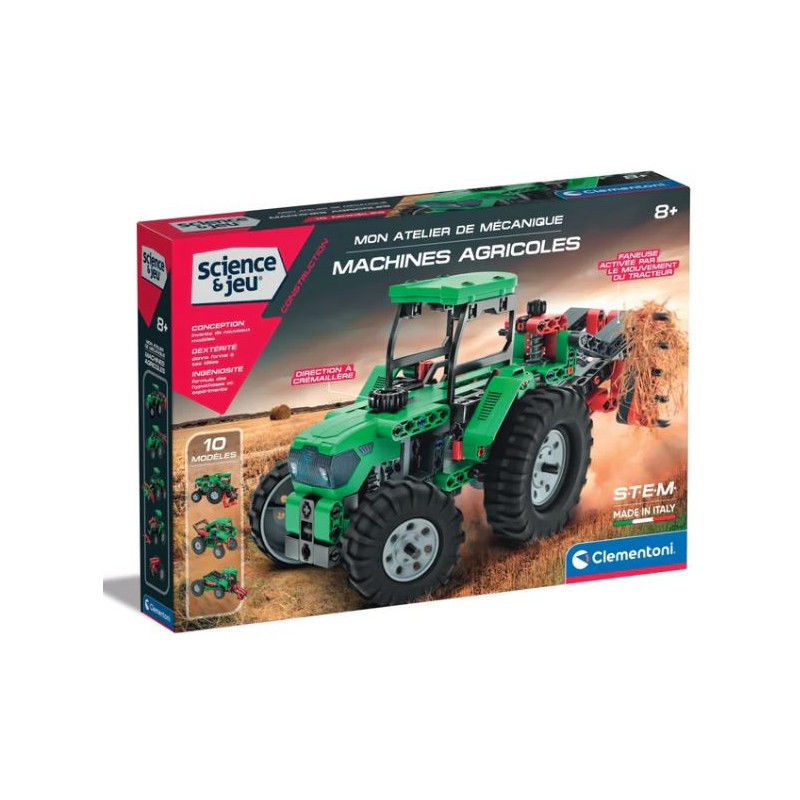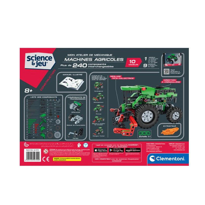 Un coffret scientifique pour s’amuser à découvrir le fonctionnement des machines agricoles. Le coffret comprend plus de 200 pièces avec lesquelles assembler 10 modèles différents. De nombreuses pièces spéciales, comme le différentiel, les engrenages, le joint universel et bien d’autres encore, permettent d’expérimenter les véhicules et de comprendre leur fonctionnement. Le manuel illustré explique comment assembler les modèles et comprend des informations sur les principes de la mécanique et de l’ingénierie. L’application gratuite « Science et jeu » propose des instructions 3D interactives pour tous les modèles. Dimensions : 39.6 x 27.8 x 6 cm
