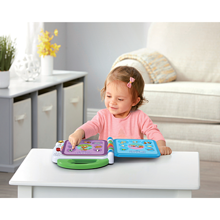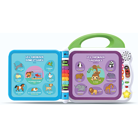 Mon premier imagier bilingue – 1,5 – 4 ans Cet imagier parlant et interactif permet de découvrir 100 mots de vocabulaire en français et en anglais avec les personnages « Les petites écoliers ». Le livre comporte 12 pages éducatives plastifiées et illustrées avec capteurs sensitifs pour sélectionner les illustrations et faire de nombreuses découvertes. Chaque page d’apprentissage est classée par thème : animaux domestiques / sauvages, fruits, aliments, couleurs, parties du corps, contraires… 3 modes de jeu : Vocabulaire, Découvertes et Sons amusants. La poignée adaptée aux petits permet une prise en main facile. 2 chansons en français + 2 chansons en anglais et effets sonores amusants. 100% bilingue ! Réglage du volume sonore et arrêt automatique. Fonctionne avec 2 piles LR6 fournies.