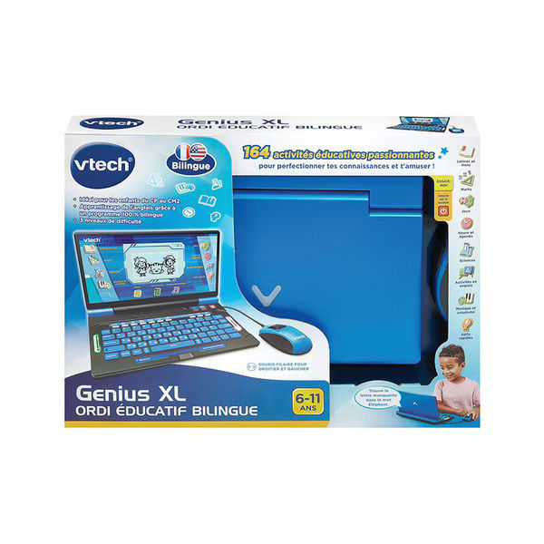 L’ordinateur éducatif bilingue Genius XL bleu est un ordinateur conçu pour accompagner les enfants dans leurs apprentissages tout en s’amusant. Entièrement bilingue (français/anglais), il propose 164 activités réparties en 8 grandes catégories : lecture, mathématiques, sciences, musique et créativité, jeux, langues étrangères, heure et défis rapides. Grâce à ses 3 niveaux de difficulté, il s’adapte à l’évolution de l’enfant et l’aide à progresser à son rythme. Les activités stimulent la logique, l’observation, la résolution de problèmes et la découverte des lettres, chiffres et formes. Équipé d’un clavier Azerty, d’une souris filaire et d’un écran LCD rétroéclairé, cet ordinateur éducatif offre une prise en main intuitive. Deux boutons lumineux permettent d’accéder rapidement aux jeux. L’enfant peut également régler le volume sonore et le contraste de l’écran à sa guise.