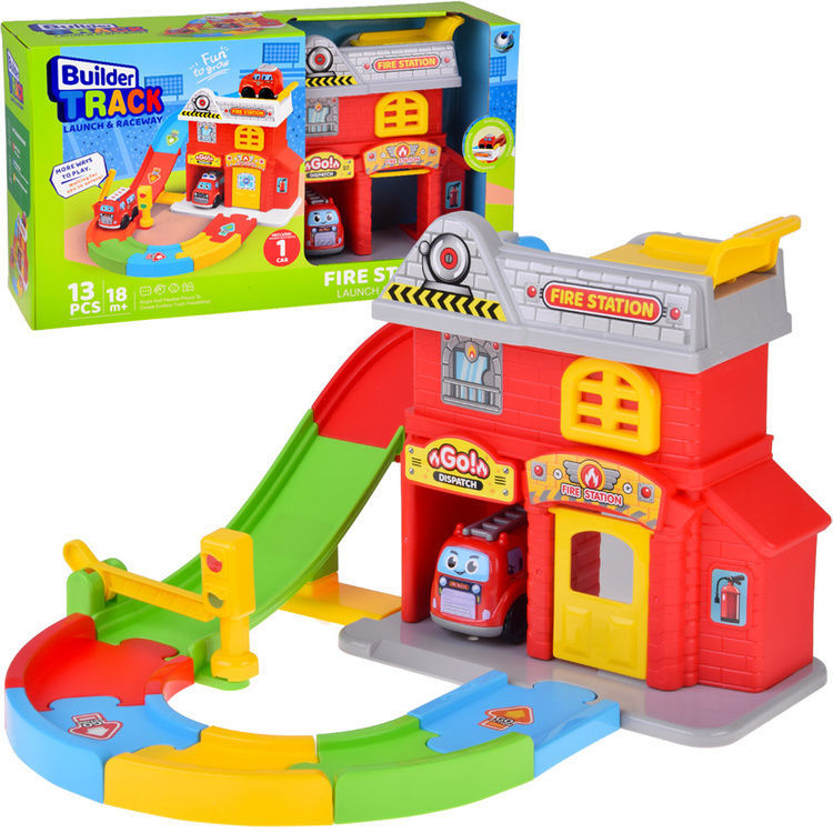 ensemble, parking, garage, circuit automobile, voitures, camion de pompiers, brigade de pompiers, bâtiment