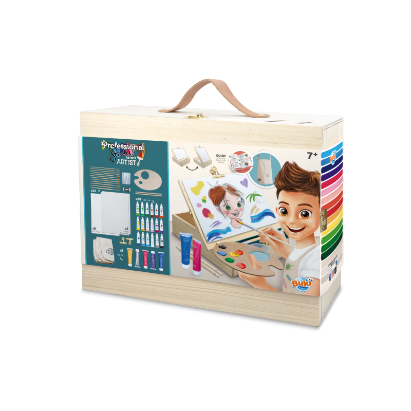 Enfile le tablier et apprends les techniques de la peinture acrylique avec cette mallette en bois qui se transforme en chevalet ! La mallette possède deux encoches pour choisir l’inclinaison du chevalet. Le chevalet peut être installé à la verticale ou à l’horizontale. Fixe ta feuille ou ta toile fine grâce aux deux clips fournis. Grâce au guide inclus, tu pourras t’initier aux techniques de la peinture acrylique ! Une fois que tu as terminé, range tous les accessoires dans la mallette et transporte-la partout grâce à sa poignée. Accessoires inclus : 1 tablier d’artiste, 2 toiles fines à peindre (format A4), 5 feuilles A4 230g, 2 clips en métal pour les fixer,12 pinceaux de différentes tailles et formes, 1 gomme, 1 crayon HB, 1 crayon 2B, 1 palette en bois avec gobelet, 18 tubes de peinture acrylique de 22ml et 5 tubes de peinture pailletée de 20ml. Guide illustrée en couleurs. Dès 7 ans.