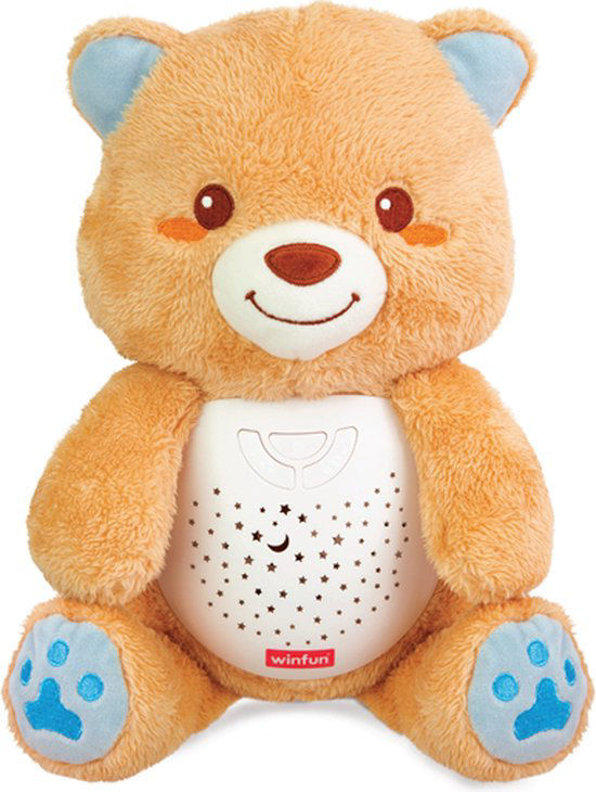 Ours Starlight 2 en 1 • Projecteur et veilleuse ours en peluche 2 en 1 • Projette un ciel étoilé apaisant • Lumière douce de différentes couleurs • Appuyez sur le bouton musique pour entendre les sons de la nature ou des berceuses apaisantes.