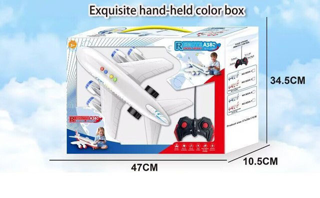L’image montre une boîte colorée et portable contenant un jouet avion télécommandé de type A380. La boîte est illustrée avec une grande image de l’avion blanc, équipé de lumières colorées sur le dessus, et accompagnée d’une télécommande noire à deux joysticks. Dimensions de la boîte : Longueur : 47 cm Hauteur : 34,5 cm Profondeur : 10,5 cm