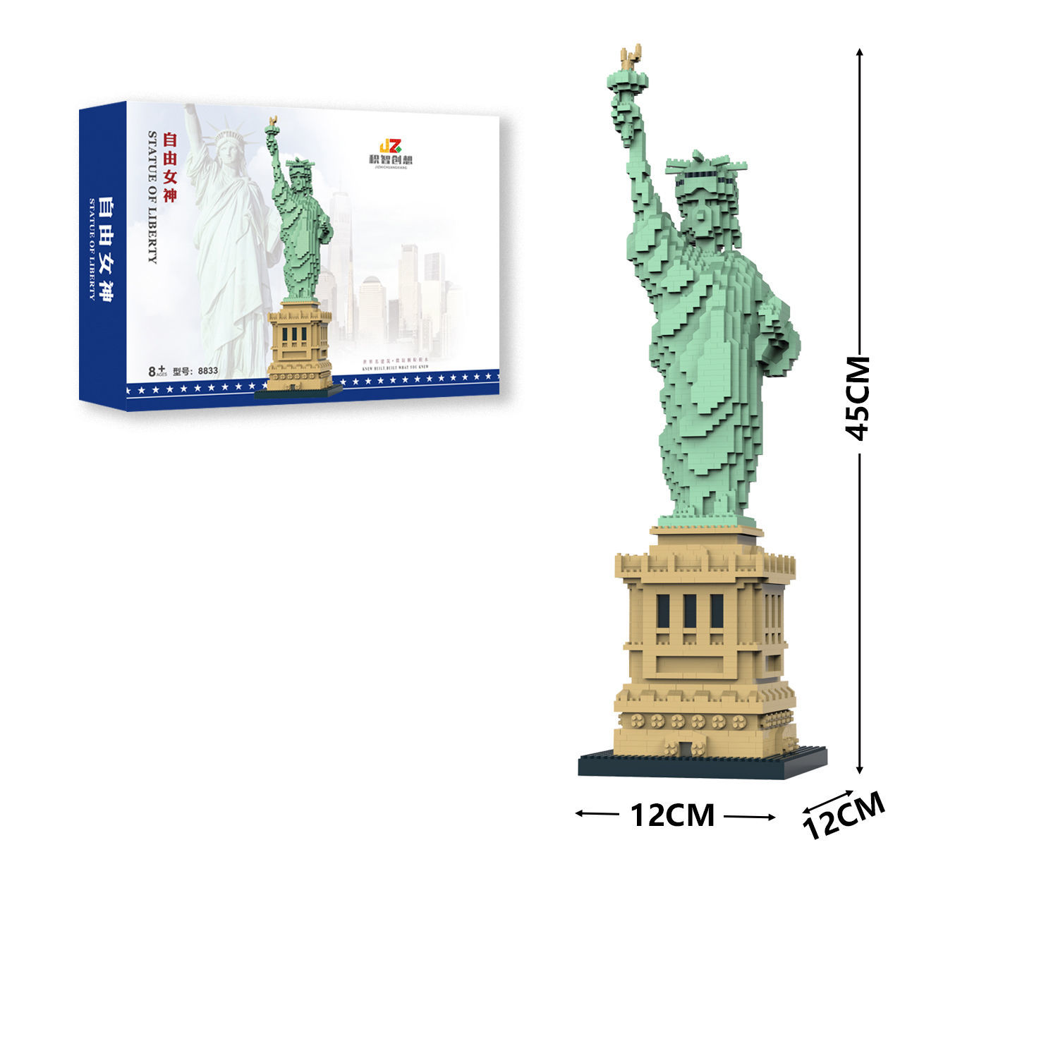 Un modèle en briques de construction représentant la Statue de la Liberté. La statue est composée de petites pièces vertes pour la partie supérieure (la figure et la torche) et de pièces beiges pour le socle. Dimensions du modèle : Hauteur : 45 cm Largeur et profondeur : 12 cm. Age à partir de 8 ans et plus .