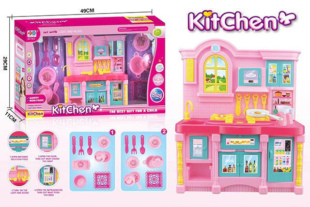 Ce jouet est un ensemble de cuisine miniature destiné aux enfants. Il est présenté dans une boîte mesurant environ 49 cm de largeur, 28 cm de hauteur et 11 cm de profondeur. L’ensemble est coloré en rose, bleu et jaune, avec un design inspiré d’une cuisine domestique. Caractéristiques principales : *Accessoires inclus : casseroles, poêles, couverts, assiettes, tasses et ustensiles de cuisine. *Éléments interactifs : portes de placards et de réfrigérateur qui s’ouvrent, boutons de cuisinière, évier avec robinet. *Effets spéciaux : lumière et musique intégrées pour un jeu plus réaliste. Décorations : autocollants représentant des aliments et des ustensiles sur les portes et fenêtres. *Utilisation : Ce jouet est conçu pour encourager le jeu d’imitation, développer la créativité et la motricité fine des enfants.