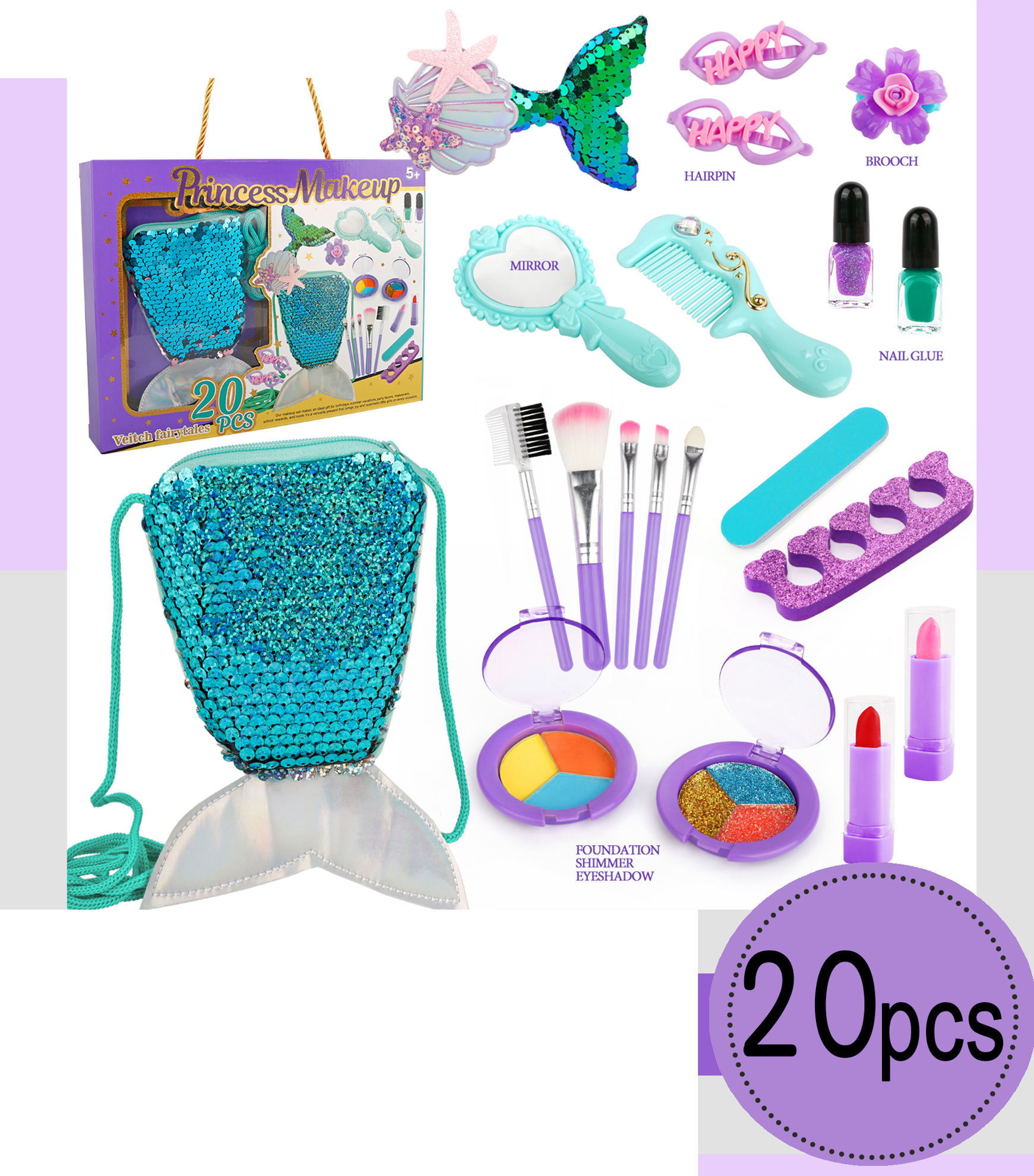 Coffret de maquillage "Princess Makeup" 20 pièces Ce coffret de maquillage pour enfants est présenté dans un emballage violet et doré avec le titre "Princess Makeup". Il contient 20 pièces sur le thème de la sirène, dont un sac à dos en forme de queue de sirène recouvert de sequins turquoise.