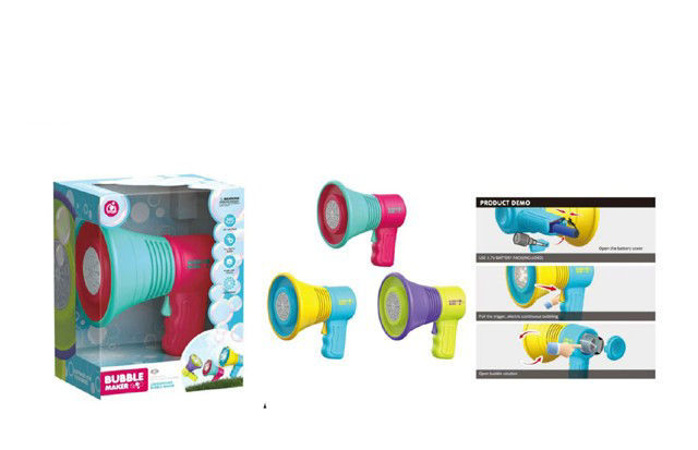 Ce produit est un pistolet à bulles coloré pour enfants. Il est disponible en plusieurs combinaisons de couleurs vives (turquoise et rose, jaune et turquoise, violet et jaune). Le jouet est conçu pour produire des bulles de savon de manière amusante et simple.