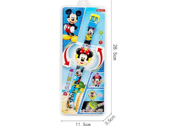 Cette image présente une montre digitale pour enfants à l'effigie de Mickey et Minnie Mouse. Le produit est emballé dans un blister transparent avec un fond bleu décoré de personnages Disney. La montre possède un bracelet illustré de plusieurs personnages, notamment Mickey, Minnie et d'autres amis de l'univers Disney.