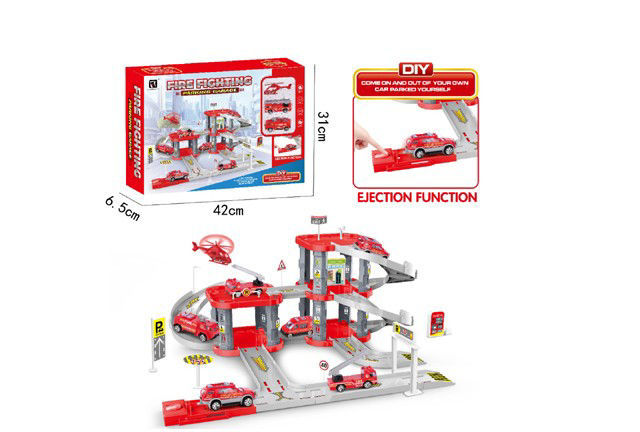 Ce produit est un ensemble de jeu de caserne de pompiers à plusieurs niveaux. Il comprend un parking en spirale, des rampes, un ascenseur pour véhicules, un hélicoptère et plusieurs voitures de pompiers miniatures. Le jouet est principalement rouge et gris, avec des panneaux de signalisation et des accessoires pour simuler un environnement de secours. Dimensions de l’emballage : 42,0 cm (longueur) × 6,5 cm (largeur) × 31,0 cm (hauteur).
