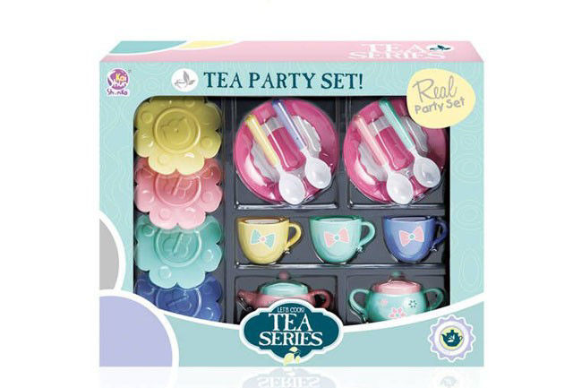 Ce coffret est un ensemble de vaisselle miniature pour jeu de thé. Il comprend : Quatre soucoupes en plastique coloré (jaune, rose, vert menthe et bleu) avec des motifs en relief. Quatre tasses assorties décorées d’un petit nœud. Une théière miniature avec couvercle et motif floral. Deux assiettes roses avec des cuillères blanches et des accessoires.