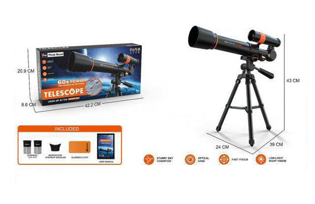 Description du télescope Ce produit est un télescope astronomique avec un grossissement de 60x, conçu pour l’observation du ciel étoilé. Il est présenté avec un trépied réglable et plusieurs accessoires. Dimensions de l’emballage : 42,2 cm (longueur) × 8,6 cm (largeur) × 20,9 cm (hauteur). Dimensions du télescope monté : hauteur 43 cm, base du trépied 39 cm × 24 cm. Accessoires inclus : *Oculaire. *Monoculaire de visée. *Chiffon de nettoyage pour lentilles. *Manuel d’utilisation.