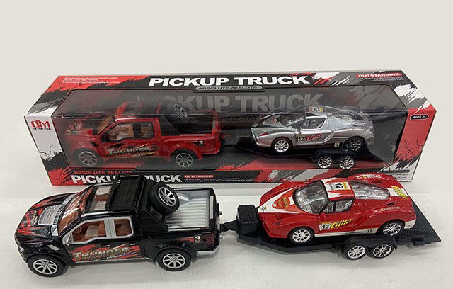 L’image présente un coffret de jouets comprenant un pick-up et une voiture de sport sur remorque. Dans la boîte, on voit un pick-up rouge avec l’inscription « Thunder » sur les portières, tractant une voiture de sport argentée.