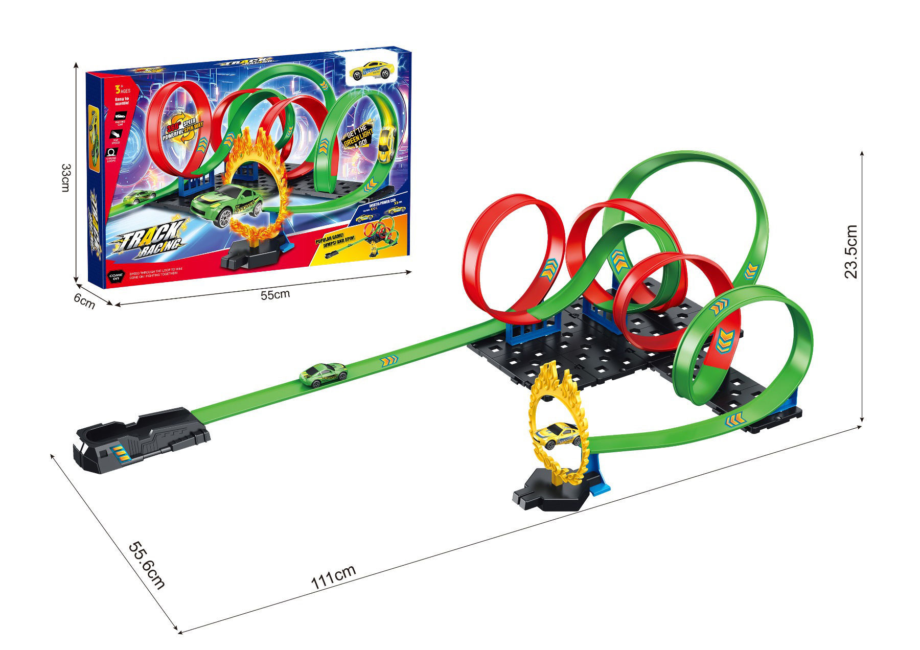 L’image présente un circuit de course pour petites voitures composé de plusieurs boucles colorées et d’un lanceur. Le circuit est principalement vert et rouge, avec quatre boucles successives et un anneau décoratif en forme de flammes par lequel la voiture passe.
