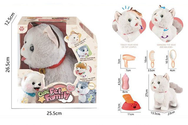 Un jouet interactif en forme de chat en peluche. Le chat est blanc avec des oreilles beiges et porte un collier rouge. Fonctionnalités : Interaction tactile : le chat réagit lorsque l’on touche ou caresse sa tête. Mouvement : il peut balancer la tête et marcher. Accessoires inclus : une brosse, un biberon, un poisson-jouet et un os en plastique, chacun avec ses dimensions indiquées sur l’image. Dimensions du jouet : environ 27 cm de hauteur, 23 cm de longueur et 13,5 cm de largeur. Ce jouet est conçu pour imiter un animal de compagnie, offrant aux enfants une expérience ludique et interactive.