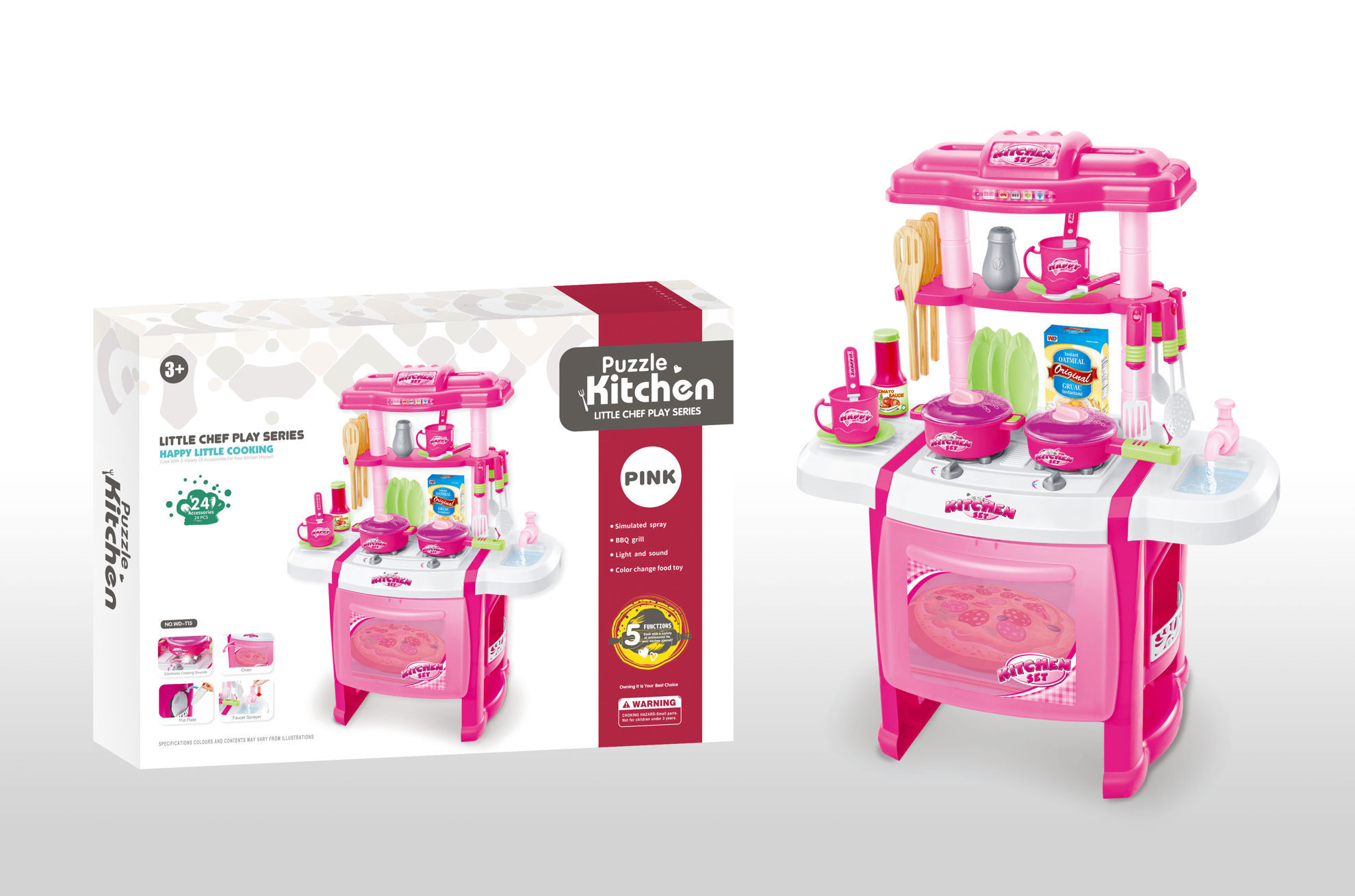 Cet ensemble de cuisine pour enfants est conçu pour le jeu de rôle et l’imagination. Le set comprend une cuisinière avec four, plaques de cuisson, évier et étagères, ainsi que de nombreux accessoires. Accessoires inclus : *Ustensiles de cuisine (spatules, cuillères, louches) *Casseroles et poêles avec couvercles *Tasses et assiettes *Bouteilles et boîtes simulant des ingrédients *Aliments factices (pizza, légumes, etc.). Convient aux enfants de 3 ans et plus Contient 24 pièces au total Cet ensemble favorise le jeu créatif, la coordination et l’imagination des enfants, tout en leur permettant d’imiter les activités de cuisine de manière ludique et sécurisée.
