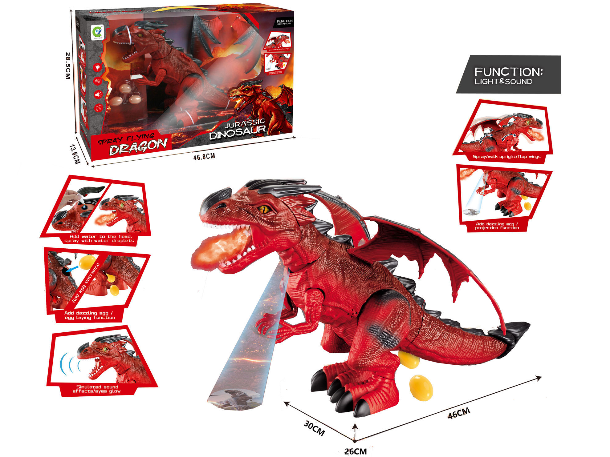 Ce jouet représente un dragon rouge de type "Jurassic Dinosaur" avec plusieurs fonctions interactives. Il est conçu pour offrir une expérience ludique et immersive aux enfants. Caractéristiques principales : Effets lumineux et sonores : le dragon émet des sons simulés et ses yeux ainsi que sa bouche s’illuminent. Projection et vapeur d’eau : en ajoutant de l’eau dans la tête, le dragon peut projeter de petites gouttelettes simulant un souffle de feu. Mouvement des ailes : les ailes peuvent battre et se déployer. Fonction de ponte : le jouet peut "pondre" des œufs en plastique fournis. Dimensions : environ 46 cm de long, 26 cm de large et 30 cm de haut. Contenu de la boîte : le dragon, des œufs en plastique, et les accessoires nécessaires à son fonctionnement. Ce jouet est idéal pour les enfants passionnés par les dragons et les créatures fantastiques, offrant à la fois un aspect décoratif et interactif.
