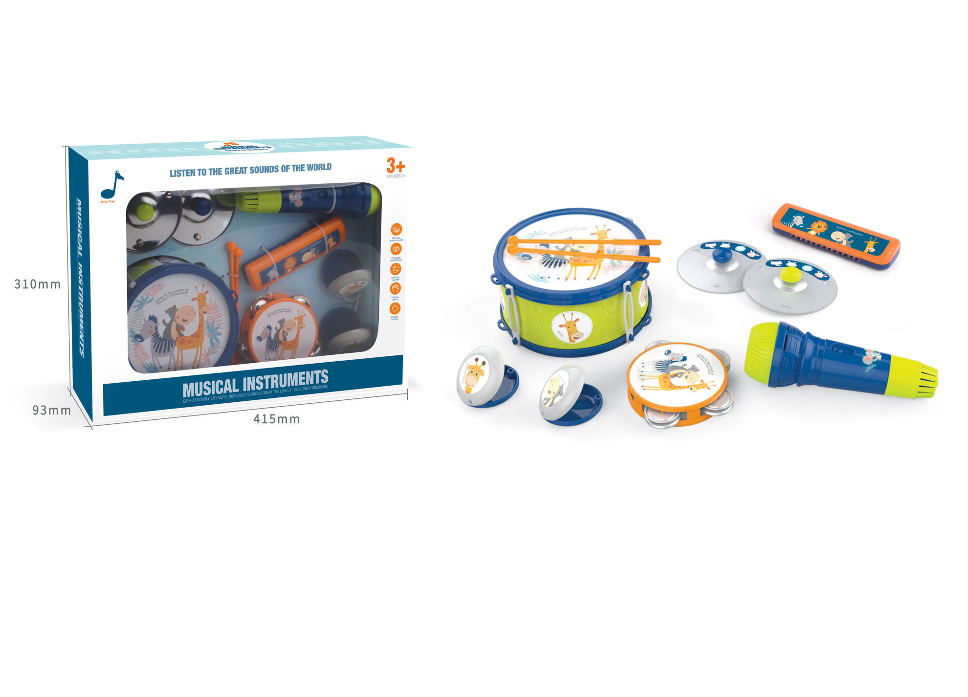 Cet ensemble d’instruments de musique est conçu pour les enfants à partir de 3 ans. Il est présenté dans une boîte mesurant 415 mm de largeur, 310 mm de hauteur et 93 mm de profondeur. Contenu de l’ensemble : Un tambour coloré avec deux baguettes. Un tambourin décoré d’illustrations d’animaux. Deux castagnettes assorties. Deux cymbales métalliques. Un harmonica. Un micro jouet. Caractéristiques : Illustrations ludiques d’animaux (girafe, zèbre, etc.). Favorise l’éveil musical et la coordination. Matériaux adaptés aux enfants. Facile à manipuler et à ranger. Cet ensemble permet aux enfants de découvrir différents sons et rythmes tout en s’amusant.