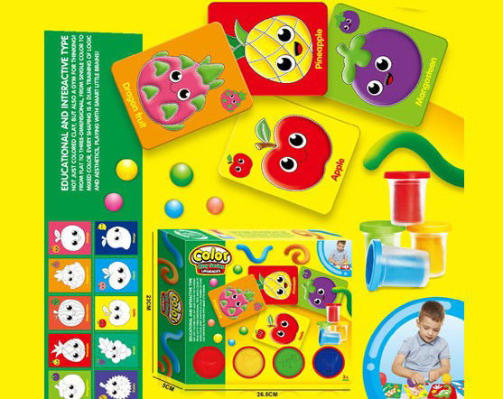 Jeu éducatif de pâte à modeler avec cartes de fruits Ce jouet éducatif et interactif est conçu pour initier les enfants aux fruits, aux couleurs et à la créativité. Le coffret comprend plusieurs pots de pâte à modeler colorée, des cartes illustrées représentant des fruits souriants (comme la fraise, l’ananas, la pomme et la mangouste), ainsi que des outils pour modeler et façonner la pâte.