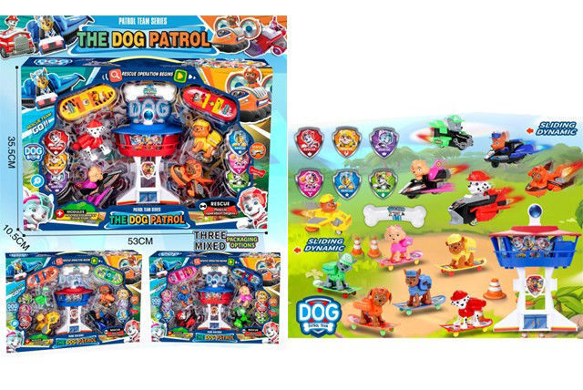 Un coffret de jeu pour enfants intitulé The Dog Patrol, inspiré de l’univers de chiens sauveteurs. Le grand coffret principal mesure environ 53 cm de large, 35,5 cm de haut et 10,5 cm de profondeur. Il contient plusieurs figurines de chiens colorés, chacun associé à un véhicule ou un accessoire, ainsi qu’une tour de contrôle centrale. Ce jouet est conçu pour encourager le jeu imaginatif et la mise en scène de missions de sauvetage.
