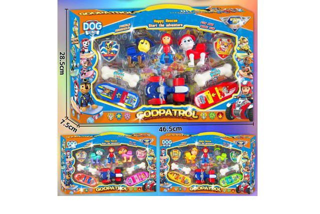 Ce coffret de jouets "Dog Patrol" contient plusieurs figurines colorées représentant des chiens et des personnages humains, accompagnés de petits véhicules et d’accessoires. A partir de 3 ans et plus .