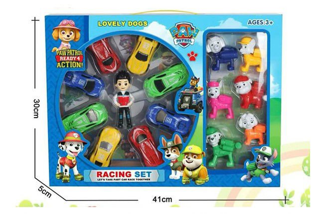 Cet ensemble de jouets contient huit petites voitures de course de différentes couleurs (rouge, jaune, vert, bleu) disposées en cercle autour d'une figurine humaine avec six figurines de chiens de différentes couleurs (bleu, jaune, rose, orange, vert, blanc) rappelant les personnages de la série Paw Patrol. Le jouet est indiqué pour les enfants âgés de 3 ans et plus.