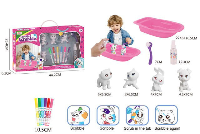 Ce coffret Scribble Scrubbie est un kit créatif pour enfants qui permet de colorier, laver et recolorier de petites figurines d’animaux.