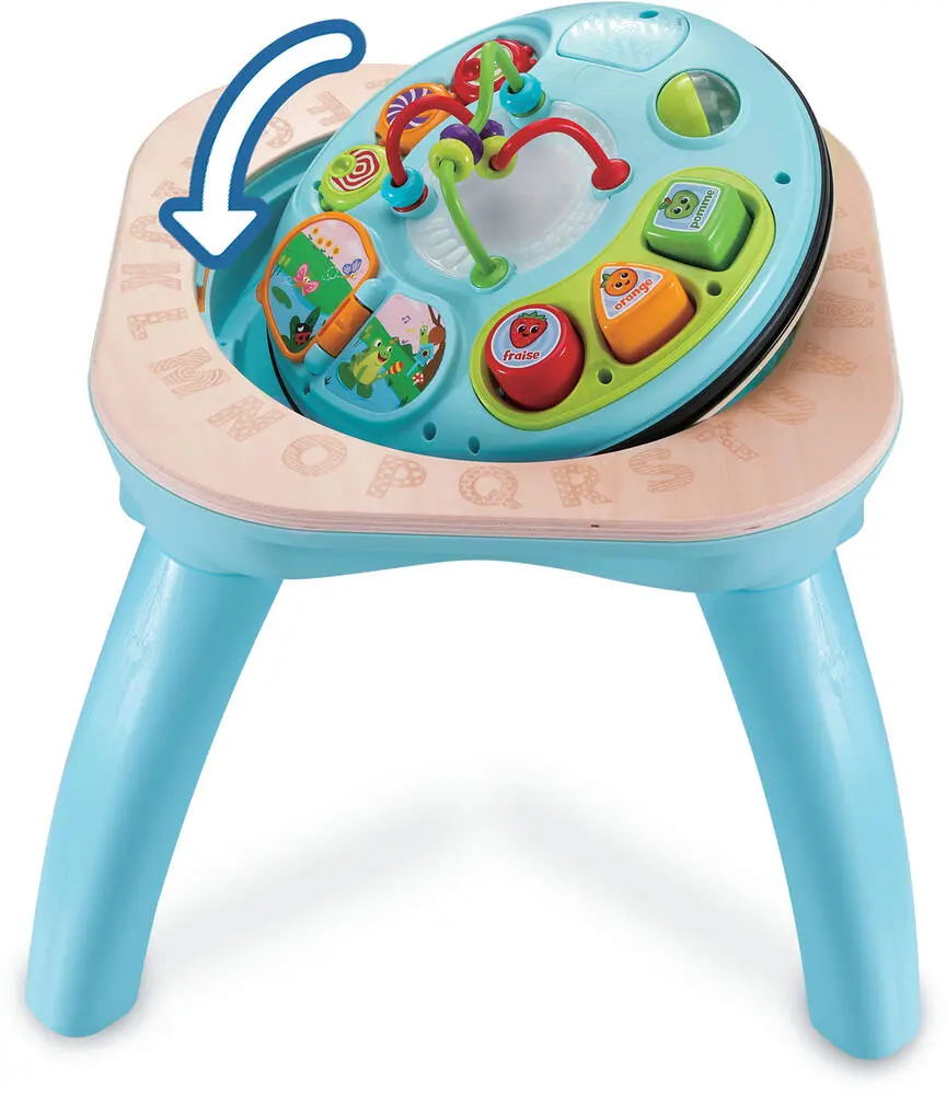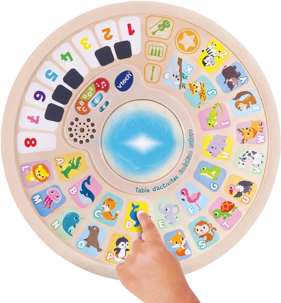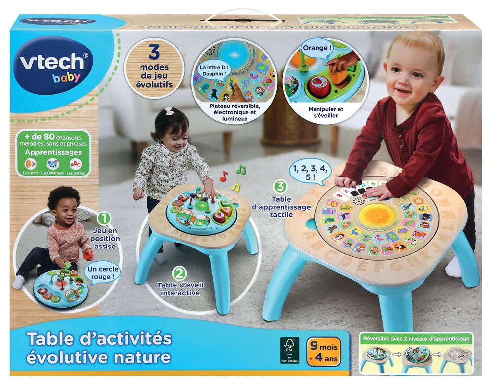 Bébé fait le plein de découvertes avec la Table d'activités évolutive nature. La jolie table évolutive, parlante et musicale, permet de multiples découvertes pour les tout-petits, dès 9 mois. L'exploration peut se faire selon 3 modes de jeu : *Jeu en position assise. *Table d'éveil interactive avec différentes manipulations. *Table d'apprentissage tactile pour de multiples apprentissages du bout des doigts. Pratique, le plateau est réversible et propose deux niveaux d'apprentissage pour évoluer avec bébé. Avec ce jouet d'éveil complet, bébé découvre différentes activités et fonctionnalités pour faire le plein d'apprentissages : *Touches sensitives : pour découvrir les animaux, leur cri, les lettres et la phonétique. *Tambour lumineux : pour que votre tout-petit compte jusqu'à dix et découvre les couleurs. *Touche étoile : pour écouter des chansons et des mélodies. *Instruments de musique : des touches de piano lui permettent de découvrir ses premières notes de piano, de flûte ou de violon. *Livre interactif : en tournant la page bébé déclenche des mélodies et des chansons entraînantes. *Formes à encastrer : votre enfant trie, appuie sur les formes et découvre les fruits, les légumes, les couleurs et les chiffres. Une activité idéale pour améliorer sa motricité. *Ce jouet pour bébé est fabriqué à partir de bois certifié FSC®. Avec les jouets VTech Baby et la Table d'activités évolutive nature, apprendre n'a jamais été aussi amusant . Le volume sonore est réglable.