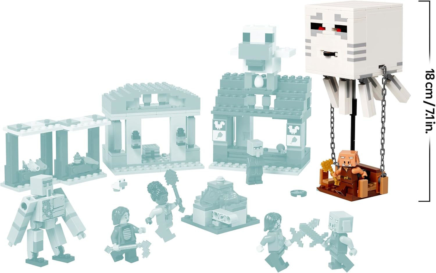 Le superbe jeu de construction Les Ghasts à l’attaque du village (21273) recrée une scène haletante de Minecraft : Le Film. Ce jeu de construction LEGO Minecraft pour enfants et adolescents offre une action explosive avec une attaque lancée depuis une montgolfière. Inspiré du jeu vidéo, il constitue un cadeau fascinant pour les garçons et les filles dès 10 ans. Le set LEGO inclut des personnages du jeu vidéo : Steve, Natalie, Dawn, 2 piglins, une montgolfière Ghast, un villageois, une poule et un golem de fer articulé. La montgolfière peut transporter les piglins et est dotée d’un lance-disques. Le village comprend des étals de marché, le restaurant de poulet frit de Steve, sa cabane d’artisan et une fontaine que les enfants peuvent faire « exploser » grâce à une fonction intégrée. Le toit du restaurant est surmonté d’une grosse enseigne en forme de poule qui peut pondre des œufs. La montgolfière Ghast mesure plus de 18 cm de haut. Le set contient 555 pièces.