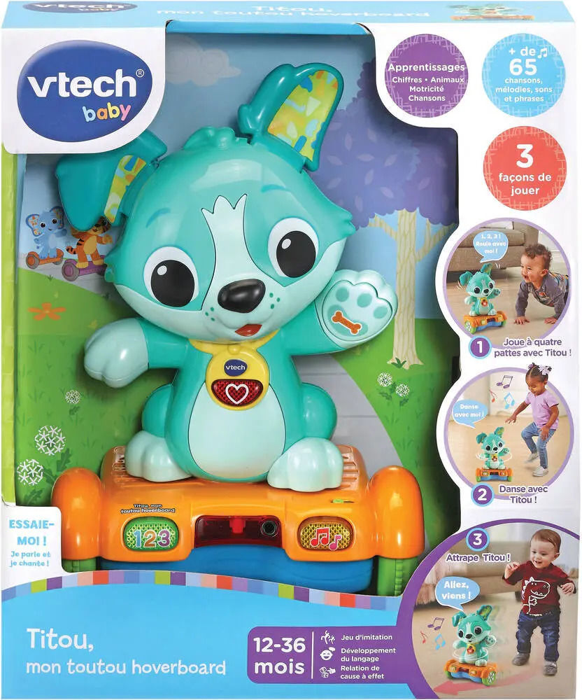 Titou invite Bébé à le suivre et s'enfuie dès qu'il approche ! Avec plus de 65 chansons, mélodies, sons et phrases. 4 capteurs de mouvements intégrés.