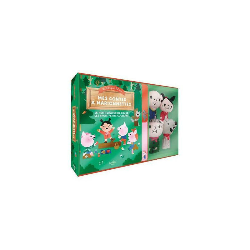 Un coffret contenant : o un livre de comptines, o un théâtre de marionnettes rigide, à poser devant soi à la verticale o et 4 marionnettes réversibles = effet de surprise. Le livre, lu par le parent, remet la comptine en tête. La partie théâtre permet à l'enfant de mimer la comptine, de devenir le maître du jeu/de l'histoire (contrôle des personnages et d'un monde en miniature), de capter l'attention des spectateurs , et enfin développer son imagination en inventant de nouvelles histoires, en modifiant la fin des contes.